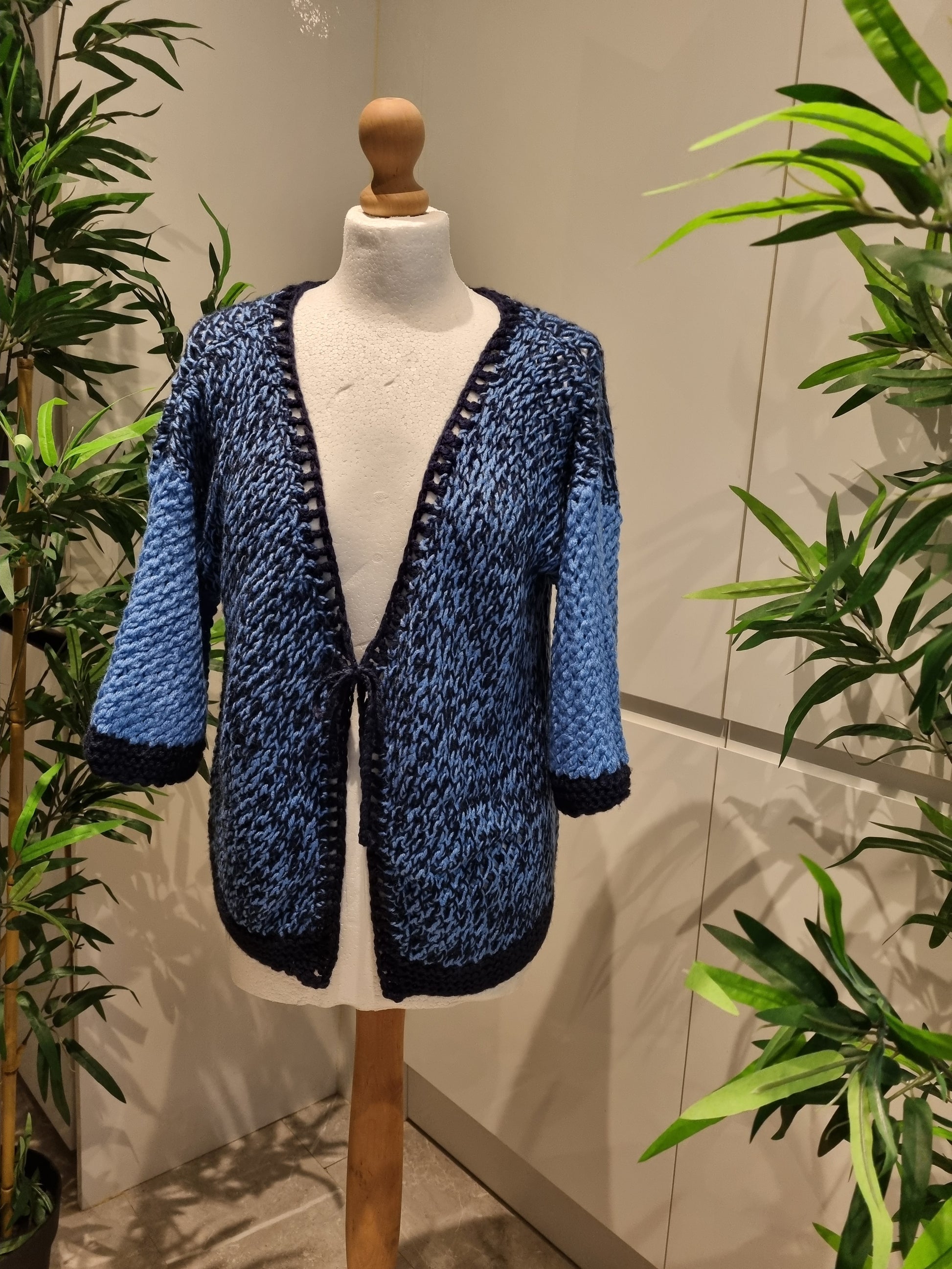 Blending comfort with contemporary style, the Blue & Black Knitted Cardigan is a versatile layering piece crafted with a unique marled knit effect. This handcrafted design features a rich mix of deep blue and black tones, creating a textured and dimensional look. Its relaxed fit and open-front silhouette make it an effortless addition to any outfit.