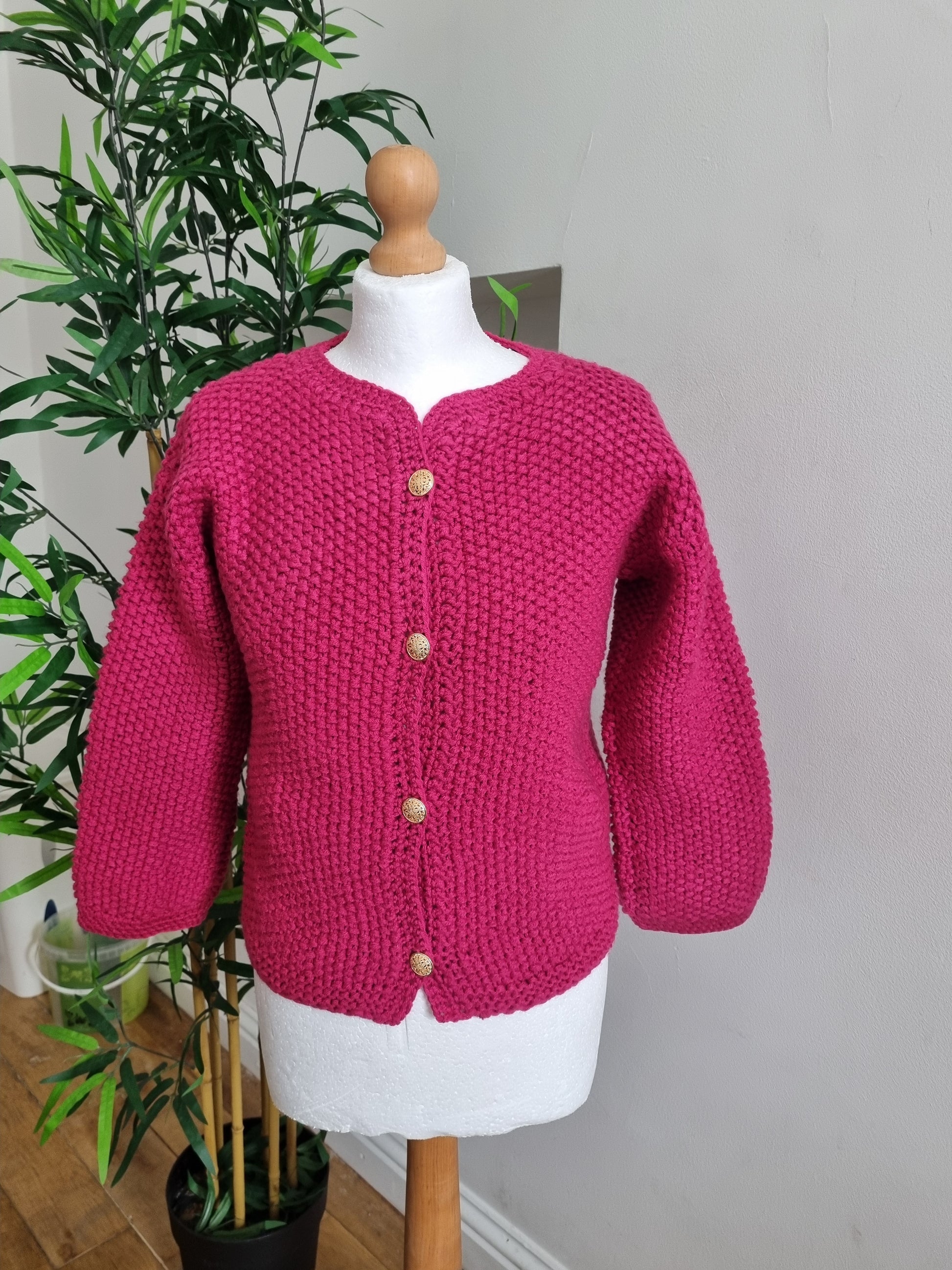 With its bright and vibrant magenta color, this cardigan is perfect for adding a bold accent to any outfit, infusing freshness and style. It is suitable for both casual and more formal occasions when you want to look elegant while feeling comfortable.