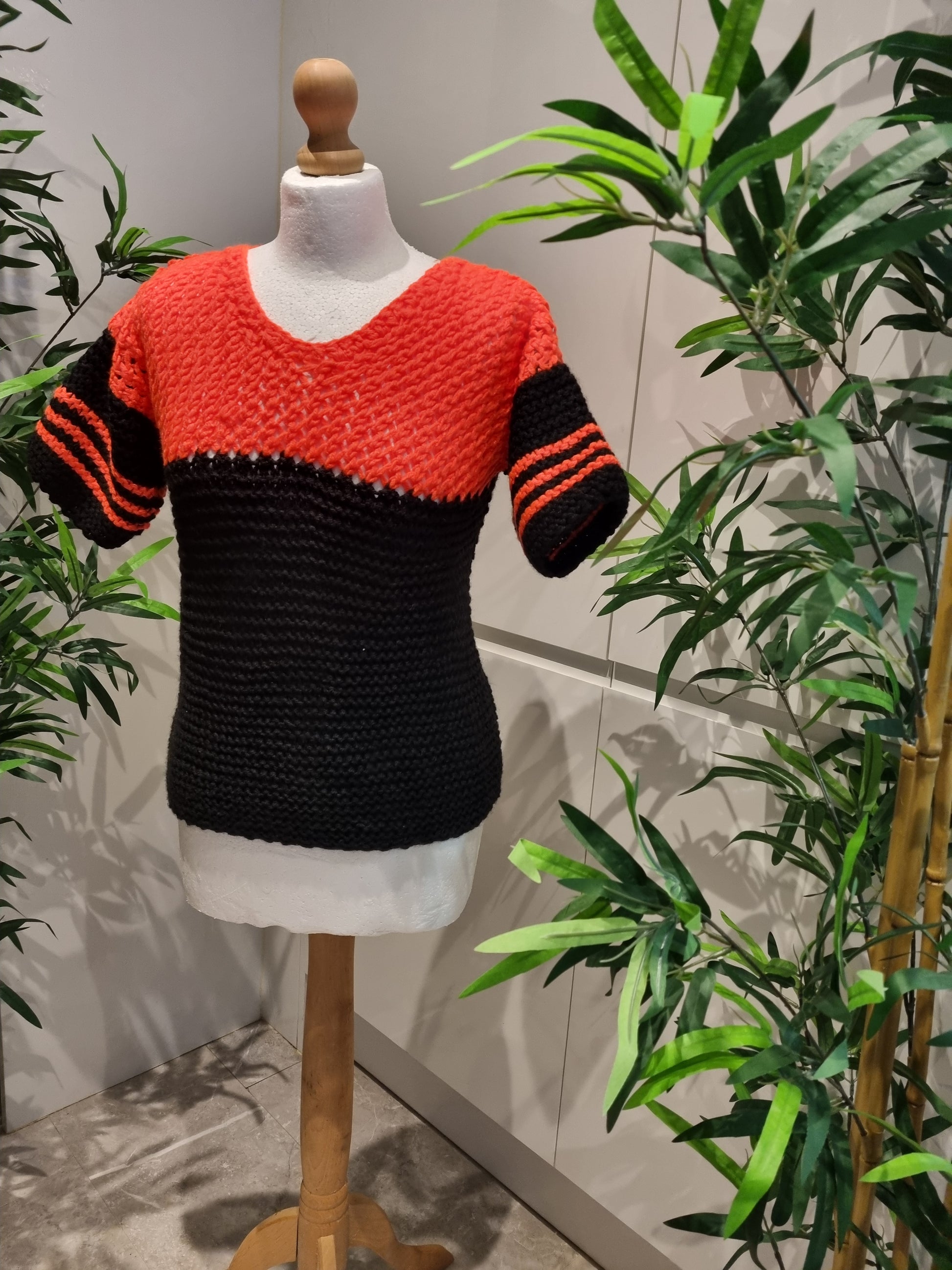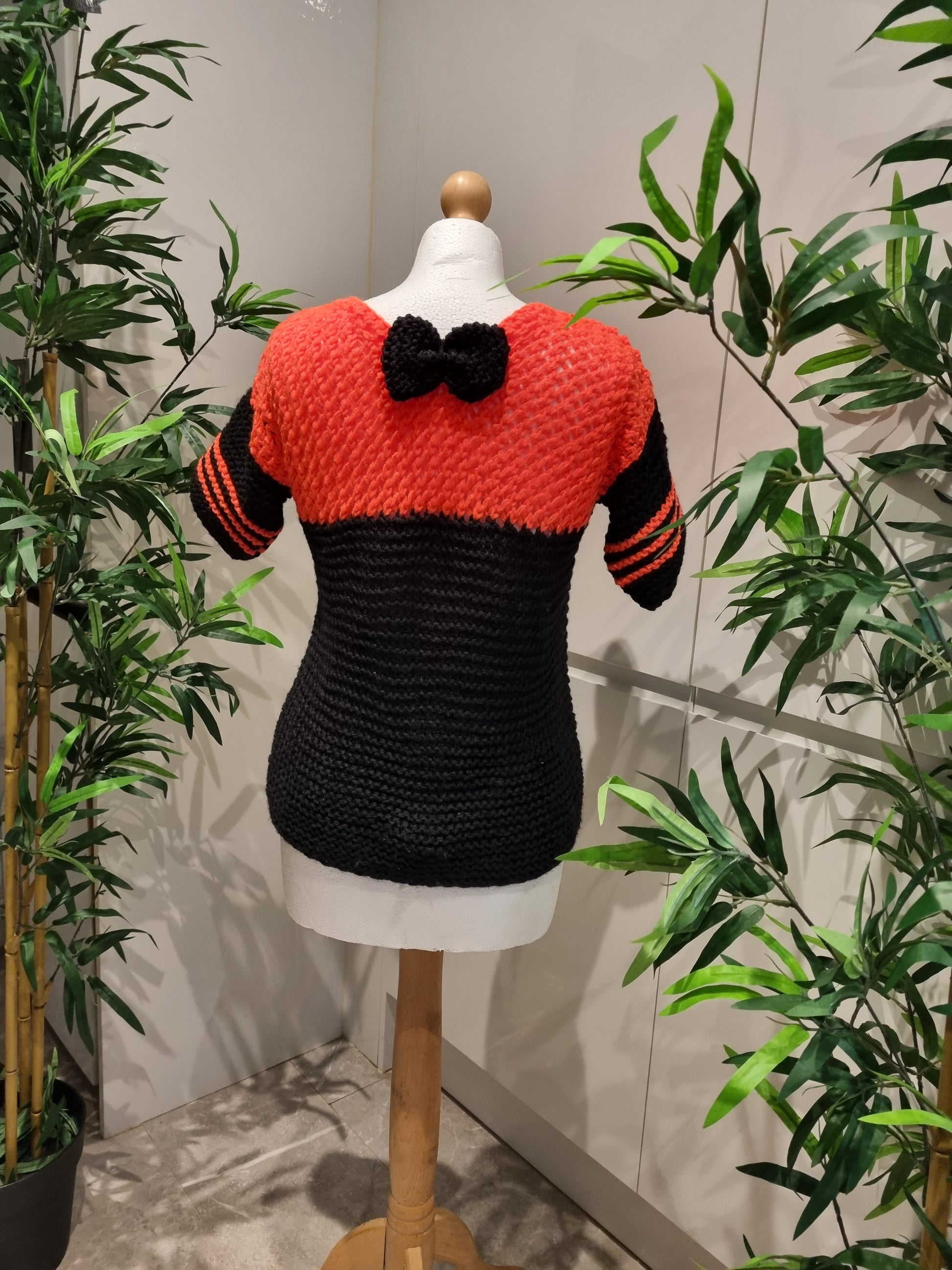 Bold yet playful, the Pink & Black Knitted Top is a statement piece that blends handcrafted texture with modern design. Featuring a striking color-block combination of vibrant pink and deep black, this top offers a structured yet comfortable fit. The contrasting sleeve stripes add a sporty touch, while the charming bow detail at the back brings a unique and feminine accent.