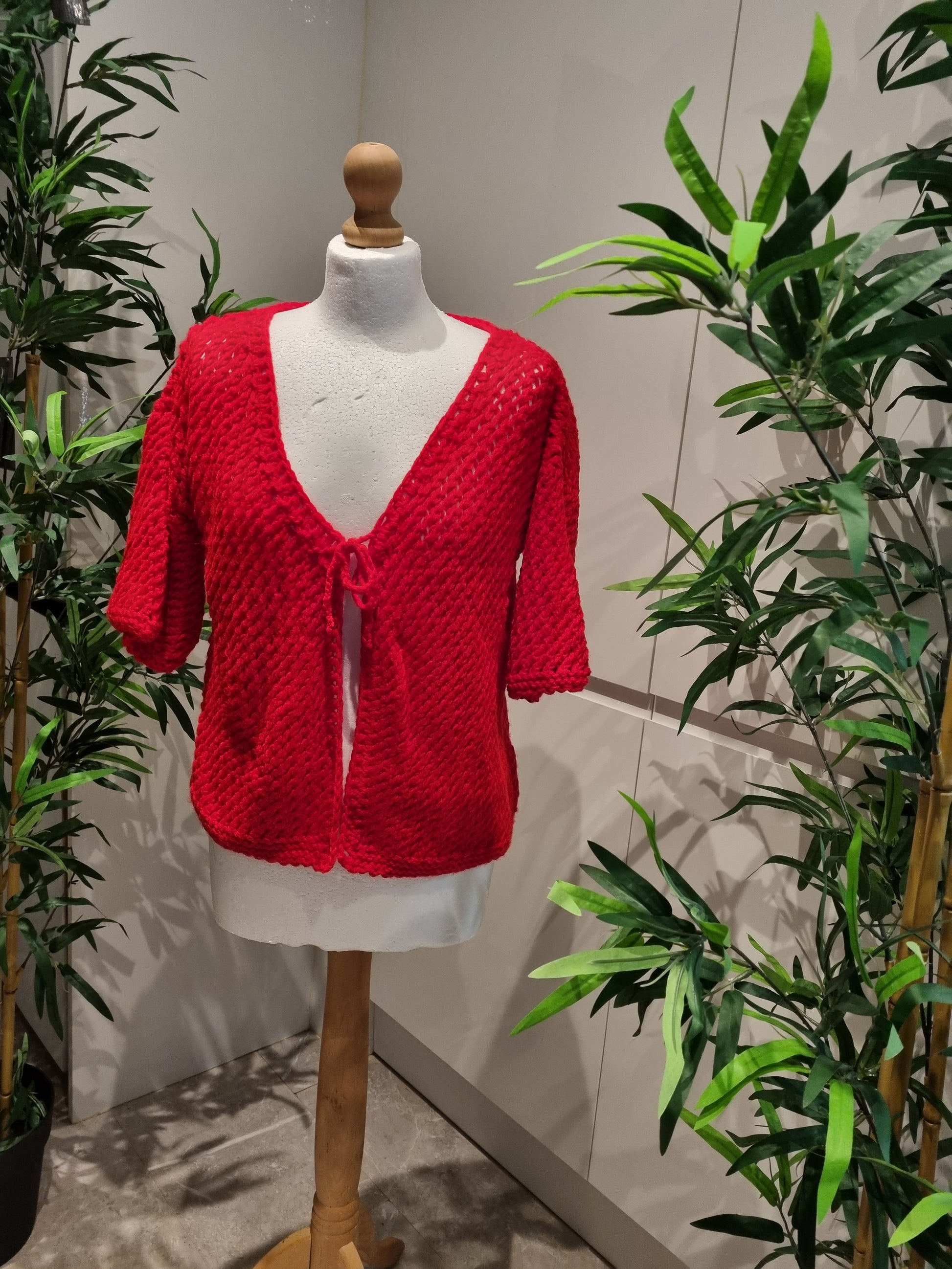 A timeless addition to any wardrobe, the Red Knitted Cardigan is a beautifully handcrafted piece designed for effortless layering. Featuring a rich red hue and an airy open-knit texture, this cardigan is both lightweight and stylish. The delicate front tie closure adds a touch of elegance, making it a versatile choice for both casual and chic outfits.